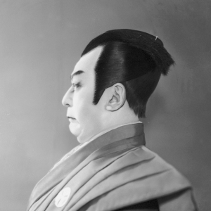 成人男性の髪は、額から頭頂部あたりを剃り上げているのが普通で、それを「月代(さかやき)」と呼びます。燕手は、その月代が伸びた状態を表わしたかつらのことを「総髪(そうがみ)」と呼びます。額から髷の根元に向かって短い毛が流れているのが特徴。燕手はその一部を漆でかためて髷の両側に出したものです。その形が燕(つばめ)の尻尾に似ていることが名称の由来とされています(客席からはちょっと確認しづらいと思いますが)。