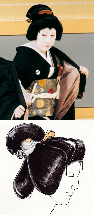 髷を丸い形にした落ち着いた雰囲気の髪型で、既婚であることをあらわします。実社会では女性が結婚すると、丸髷を結っており、歌舞伎でもそれにならうことが多いのですが、既婚女性の役が必ずしも丸髷を結っているわけではありません。『仮名手本忠臣蔵 九段目』の由良之助の妻・お石の髪は丸髷です。(田村民子)