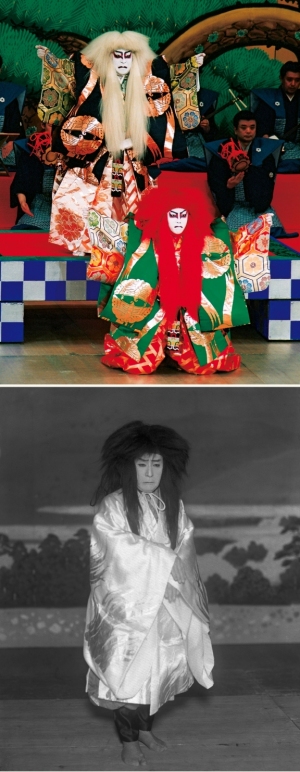 『連獅子』[左から]狂言師右近後に親獅子の精(市川猿之助)、狂言師左近後に子獅子の精(市川亀治郎) 平成13年7月歌舞伎座