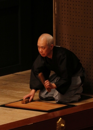 俳優の演技中に舞台上手(かみて=右側)の端で、木の板をツケ木で打って、演技を強調する演出法。すでに誇張されている歌舞伎の演技を、さらに音で誇張するとはまさに歌舞伎ならではのアイディア。大きな見得や六方といった活発な動作には「バタバタバタ、バッタリ」と派手に打ち上げます。また何か物が落ちた時なども、それを印象付けるためにさりげなく打たれます。舞台上に置くツケ板は欅(けやき)、手に持つツケ木は樫(かし)で、このツケ木は開幕時などを告げる柝(き)とは別物です。これを担当する「ツケ打」は東京では大道具方、上方では狂言方の役割となっています。(金田栄一)