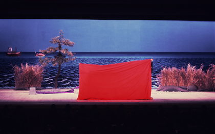 芝居の進行上で不要になったもの、特に死んだ人物などを舞台上から引っ込めるため目隠しとして使う幕を消し幕といいます。黒い幕または緋毛氈を黒衣(後見)が広げて人物を隠し、ゆっくり移動して舞台上から消し去ります。黒という色は歌舞伎において「見えていない」約束になっていますので黒幕を使うのが基本ですが、歌舞伎十八番をはじめ様式性の高い演目の場合は舞台全体の視覚的バランスから華やかな緋毛氈が用いられます。また『伽羅先代萩』床下で荒獅子男之助がせり上がる場面など、舞台のセリ(切り穴)から人物が登場してくる場合や、あるいは舞台上で俳優が化粧や扮装を変えるときなど、目隠しが必要な場合にこの消し幕が利用されます。(金田栄一)