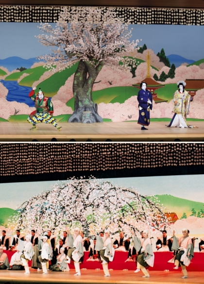 主に舞踊劇や時代物で、舞台の上部一面に吊り下げられる造花や木の枝のことを指します。初春なら梅、春なら桜、夏なら柳、秋は紅葉など、舞台の季節感を強調し、観客を芝居の世界へと誘う華やかな飾りです。『菅原伝授手習鑑』車引の梅の吊り枝、『義経千本桜』吉野山や『助六由縁江戸桜』『京鹿子娘道成寺』の桜の吊り枝、『色彩間苅豆』の柳の吊り枝などが代表的です。(東功吾)