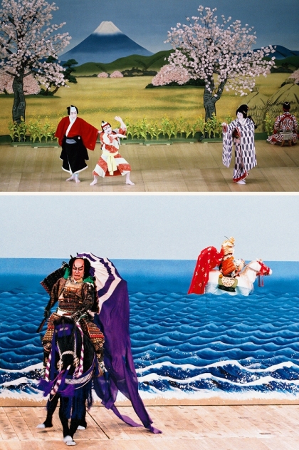 もう一つは、登場人物と同じ扮装をした子役を登場させて人物が遠くにいるように見せることです。奥行のない歌舞伎の舞台ならではの遠近法の技法です。『一谷嫩軍記』の須磨浦の合戦で、熊谷直実と平敦盛が組み討ちになる場面や、『恋飛脚大和往来』新口村の道行で梅川と忠兵衛が遠くに去っていくのを孫右衛門が見送る場面で、大人の歌舞伎俳優が演じていた人物が、突然、扮装はそのままで遠見の可愛い子役に替わる、そのギャップが歌舞伎らしい遊びのある楽しい演出方法です。(東功吾)
