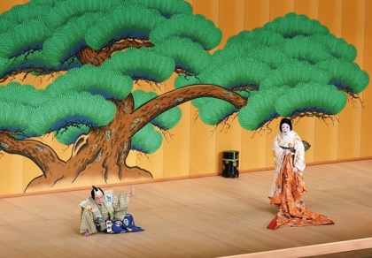 舞台の背景に使われる松を描いた羽目板を松羽目といいます。能舞台をまねて正面に老松を描き、左右の袖には竹が描かれています。能舞台の鏡板(かがみいた)は常設ですが、歌舞伎では大道具の一部で、『勧進帳』や『素襖落』など、能や狂言をもとにした演目で使われます。そこから、それらの演目を「松羽目物」と呼ぶようになりました。(東功吾)