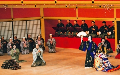 『廓文章』[左から]女房おきさ(片岡秀太郎)、吉田屋喜左衛門(片岡我當)、藤屋伊左衛門(中村鴈治郎)、扇屋夕霧(中村雀右衛門) 平成16年11月歌舞伎座