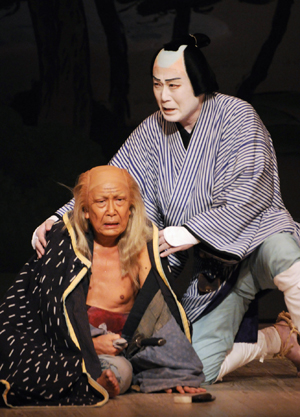 『伊賀越道中双六』沼津[左から]雲助平作(中村歌六)、呉服屋十兵衛(中村吉右衛門)の親子の別れ 平成22年9月新橋演舞場
