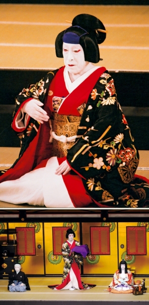 『伽羅先代萩』[左から]一子千松(中村玉太郎)、乳人政岡(中村魁春)、足利鶴千代(上村吉太朗) 平成23年3月新橋演舞場