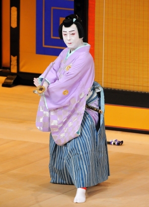 前髪の付いた元服前の若い男性すなわち少年の役どころで、か弱さやほのかな色気も感じさせる美少年として描かれます。前髪が付いているのはもちろんですが、着物の襟を女性のような「抜き衣紋(えもん)」の形に着るのも特徴の一つです。主な役には『仮名手本忠臣蔵』の大星力彌、『妹背山婦女庭訓』の久我之助(こがのすけ)、また『菅原伝授手習鑑』の桜丸は妻帯者で成人しているはずですが、役柄としては前髪の付いた若衆の形で演じられます。(金田栄一)