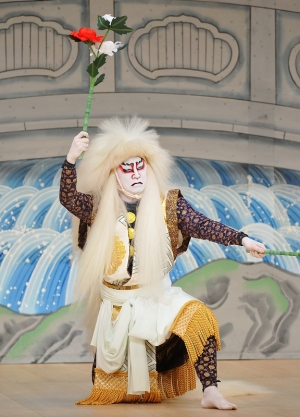 獅子はライオンが元となった伝説上の霊獣で中国の清涼山(せいりょうざん)に生息すると伝えられます。獅子は仏教では文殊菩薩の乗物とされ、清涼山にかかる現世と浄土をつなぐ石橋の下は千尋の谷があり、人は渡れません。先行芸能の能には『石橋(しゃっきょう)』という獅子物の曲があり、その影響を受けた歌舞伎舞踊がたくさん作られています。古くは『枕獅子』などの女方舞踊がありましたが、時代が下がると立役も演じるようになり、明治以降には『鏡獅子』『連獅子』といった大曲が出来上がりました。獅子物あるいは石橋物と呼ばれるジャンルとして定着し、今もよく上演されます。特に後半で獅子の毛を大きく勇壮に振る「狂い」の場面が圧巻、常に観客を沸かせます。(金田栄一)