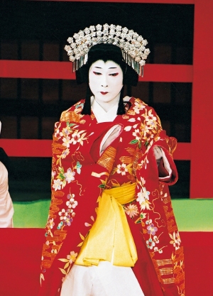 歌舞伎に登場するお姫様役の総称で、着ている衣裳の色が概ね赤なのでこう呼ばれています。これは役柄の名称であると同時に衣裳そのものの名称でもあります。赤の色には美しさや高貴な身分が表現され、そして恋に燃えるなどの一途さ、時には激しい気性もこの色に込められています。(金田栄一)
