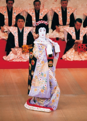長唄は歌舞伎舞踊伴奏音楽として発生・発達した音楽で、歌舞伎と長唄は互いにその発展に寄与しながら成長を遂げたといえます。数ある歌舞伎舞踊の大半はこの長唄舞踊で、あくまでも歌舞伎オリジナルな曲と舞踊ということができます。唄、三味線に鳴物(お囃子)が加わった「長唄囃子連中」で演奏されることが多く、リズミカルでいかにも歌舞伎舞踊らしい明るく華やかな舞台が展開されます。もっとも代表的なものに『京鹿子娘道成寺』があります。いろいろな題材を踊り分ける変化(へんげ)舞踊の中からは、『藤娘』『越後獅子』などが独立して演じられています。また明治以降には『鏡獅子』『連獅子』など大曲が出来上がりました。(金田栄一)