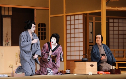『与話情浮名横櫛』[左から]切られ与三郎(市川染五郎)、妾お富(中村福助)、和泉屋多左衛門(中村歌六) 平成22年1月歌舞伎座