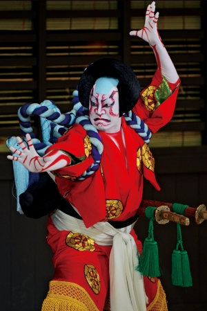 ひときわ太い襷で、荒事などに登場する超人的な役がこれを付けます。襷は、仕事をするときに袖の始末をよくするための実用品ですが、古くは神を祀る神事に用いられたものです。背中に華やかに大きく結ばれる仁王襷は、普通の人間ではない能力を持った、特別な存在であることを示しています。『暫』の鎌倉権五郎景政や『義経千本桜~鳥居前』の忠信などがこれをつけています。(田村民子)