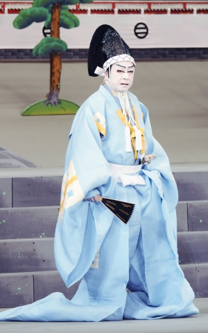 大紋は、その名の通り大きな家紋が袖や胸、背中などに柄として付いているのが特徴で『仮名手本忠臣蔵』「大序」などで見られます。素襖は『身替座禅』の山蔭右京などが着ています。また『素襖落(すおうおとし)』という演目では、素襖が小道具のような形で登場します。(田村民子)