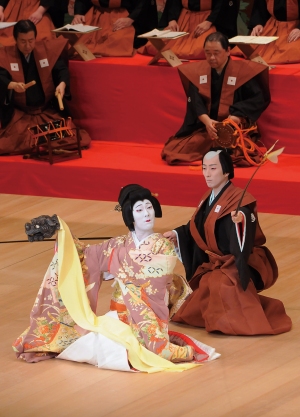 舞台上で演技者を補助して小道具を渡したり片づけたり、また衣裳を整えたりさばいたりと、演技が円滑に行くよう細かな作業を受け持つ人を後見と呼びます。いずれの場面でも芝居や舞踊の段取りや流れをすべて心得た上で、呼吸を合わせてタイミングよく動かなければなりませんのでこの人たちも俳優、おもにその演技者の弟子が勤めます。一見単純作業のようですが熟練の技と信頼が必要で、ベテランによる陰の名人芸が発揮されます。時代物など芝居の場合は「見えていない約束」とされる黒装束で、顔も黒の紗(しゃ)で隠した黒衣(くろご)となり、舞踊や歌舞伎十八番など様式性の高い演目では裃(かみしも)を付けた裃後見、あるいは黒紋付の着付け後見といった姿で周りの舞台面と協調した形を取ります。(金田栄一)