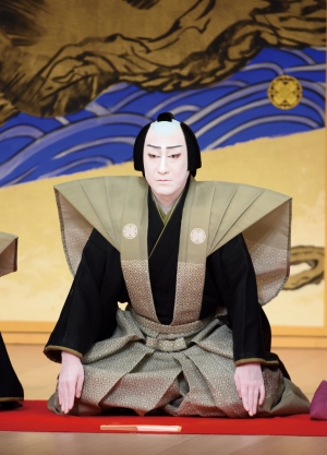 口上は、口頭で伝言すること、直接相手に伝えることです。せりふではなく、舞台上から役者が直接観客に向かって述べる挨拶を、歌舞伎では「口上」と呼びます。「口上」だけで一幕とすることもあり、お芝居の途中で出演者が揃って客席に向いて挨拶を述べることを「劇中口上」と呼びます。古くは役者ばかりでなく座元と呼ばれる劇場代表者も並んで述べていました。現在最もお馴染みなところでは襲名あるいは初舞台といった役者の慶事の披露口上があり、とりわけ人気を呼んでいます。名優を偲ぶ追善興行では、「追善口上」が行われることもあります。観客に敬意を表する「東西東西」に始まり、「隅から隅まで ずずずい~っと希い(こいねがい)上げ奉りまする」と結ぶのが定型です。また幕切れで芝居を止め「まず今日はこれぎり」と述べるのを「切り口上」といい、これは日常会話の中にも取り入れられています。『仮名手本忠臣蔵』の通し上演では大序の開幕前に口上人形が登場し、役人替名(やくにんかえな=配役)を軽妙に述べます。(金田栄一)