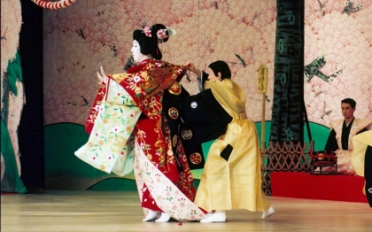 『京鹿子娘道成寺』[左から]白拍子花子(中村勘九郎)、後見(中村千彌) 平成7年10月歌舞伎座
