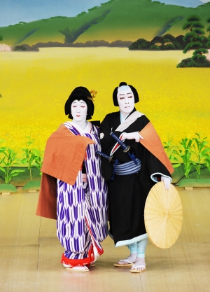 代表的な『義経千本桜』の「道行初音旅」は静御前と佐藤忠信(実は源九郎狐)が主従であって恋人ではありませんが、「女雛男雛」の振りを見せてほのかな恋心も表現され、『仮名手本忠臣蔵』の「道行旅路の花聟」はおかる勘平が主君への不忠を詫びつつ恋の逃避行を見せます。『曽根崎心中』ではお初と徳兵衛が共に手を取り合い死出の旅路へと進んで行きます。道行の男女はおおむね女性が主導となり男性はむしろ受け身という、社会通念と異なって描かれるのもひとつの特徴でしょう。(金田栄一)