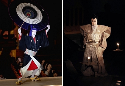 いっぽう、芝居の途中あるいは幕切れで、登場人物が花道を使って引っ込む場面はとりわけ印象的です。その演出をとくに「引っ込み」と呼びます。単にストーリー上の段取りではなく、そのわずかな時間の中に、その役者あるいはその役のあらゆるものが凝縮され、観客に大きく印象付ける極めて重要な瞬間となっています。『勧進帳』の弁慶の花道の引っ込み、また『伽羅先代萩』の仁木弾正が花道揚幕を見据えて悠然と引っ込む様など、それまでの紆余曲折のドラマをまさしくこの引っ込みの人物が一身に背負って表現し、観客の目の奥にその残像を残すのです。(金田栄一)