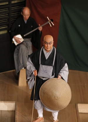 『熊谷陣屋』熊谷次郎直実(松本幸四郎)の花道の引っ込みで合引に右足を乗せて「送り三重」を弾く杵屋栄津三郎 平成26年11月歌舞伎座
