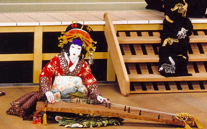 箏は黒御簾や舞踊の舞台で演奏されるほか、舞台で俳優が弾くこともあります。代表的な演目は『壇浦兜軍記(だんのうらかぶとぐんき)~阿古屋琴責』。五條坂の遊君阿古屋が恋人である平家の武将・悪七兵衛景清(あくしちびょうえかげきよ)の行方を問い詰められる場で、箏と胡弓、三弦を演奏させられます。『生写朝顔話(しょううつしあさがおばなし)』では、秋月の息女深雪が恋人を追って盲目となり、「島田宿の場」で瞽女(ごぜ)朝顔になって箏を弾きます。