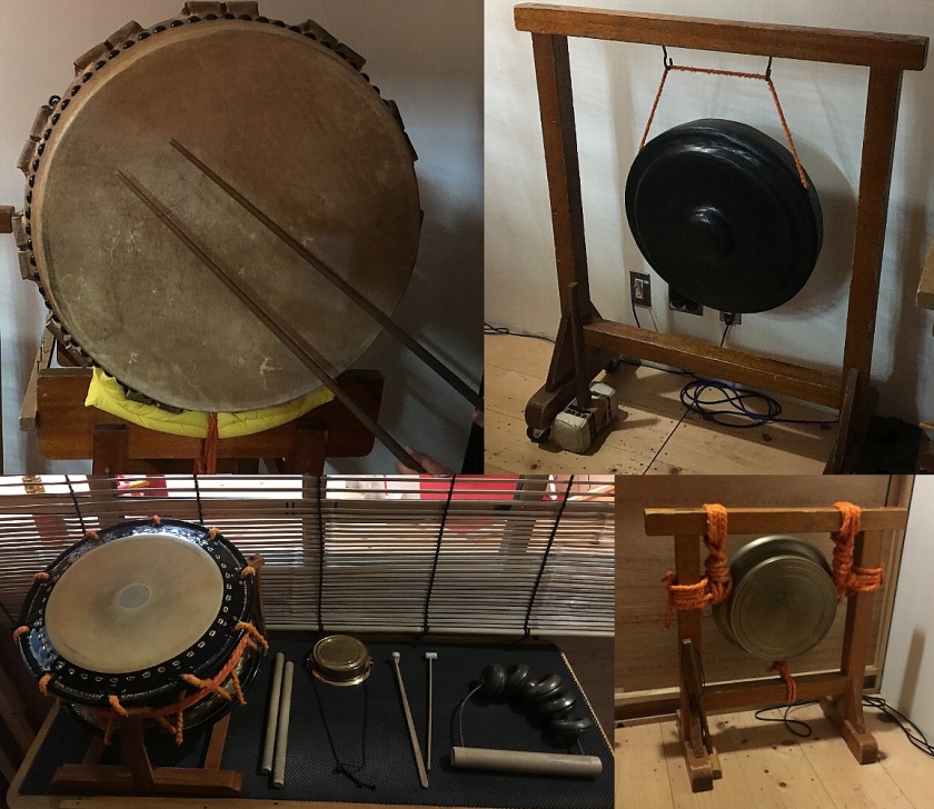 黒御簾の楽器の一例。左上から時計回りに大太鼓、銅鑼、双盤、駅路、当り鉦、締太鼓。