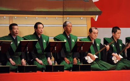豊後節系の富本節から分かれた浄瑠璃で、二代目富本斎宮(いつき)太夫が江戸後期の文化年間に清元延寿太夫と名乗り創始しました。やがて清元が隆盛してゆく中、富本節は次第に影を潜め衰退してゆきます。清元は江戸時代に生まれた浄瑠璃の中では最も後発ですが、常磐津と並んで歌舞伎音楽として大きく発展、特に歌舞伎舞踊に欠かせない浄瑠璃となり『落人』『隅田川』『三社祭』『かさね』など名曲が次々と生まれました。非常に高い音域を多用して、粋で艶っぽい語り口が特徴、出語りの肩衣は萌葱(もえぎ=緑)色、使用する三味線は常磐津と同様の中棹です。(金田栄一)