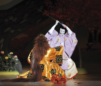 『紅葉狩』[左から]更科姫実は戸隠山の鬼女(市川染五郎)、余吾将軍平維茂(尾上松緑) 平成27年9月歌舞伎座
