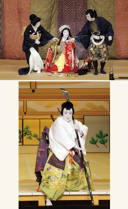 『一條大蔵譚』[左から]鬼次郎女房お京(片岡孝太郎)、常盤御前(中村時蔵)、吉岡鬼次郎幸胤(尾上菊之助) 平成27年10月歌舞伎座