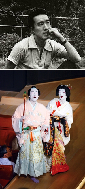 昭和を代表する文豪として海外でも知名度の高い三島由紀夫は、本名平岡公威(ひらおか きみたけ)といい、1925(大正14)年1月14日に東京で二代続く官吏の家に生まれました。学習院の中等科に進む頃から深く文学に傾倒し創作活動を始め、16歳の時に初めて三島由紀夫の筆名で、雑誌「文芸文化」に小説『花ざかりの森』が掲載されます。東京帝国大学法学部を卒業後、大蔵省勤めを経て、作家として『仮面の告白』『潮騒』『金閣寺』『豊饒の海』四部作など多くの小説を発表しました。同時に戯曲にも意欲を示し、能に取材した近代能楽集として『卒塔婆小町(そとばこまち)』『葵上(あおいのうえ)』ほか、『鹿鳴館(ろくめいかん)』、『サド侯爵夫人(さどこうしゃくふじん)』、江戸川乱歩の原作を脚色した『黒蜥蜴』などを発表しています。歌舞伎作品は1953(昭和28)年12月、松竹の依頼により芥川龍之介の短編を原作とした『地獄変(じごくへん)』を書いたのをはじめとして、6作品を舞台にのせています。古典歌舞伎の様式を模した華麗な作風は<三島歌舞伎>といわれ、新作の歌舞伎作品の中でも特異な輝きを放っています。さらに1959(昭和34)年11月には四世鶴屋南北作『桜姫東文章(さくらひめあずまぶんしょう)』の復活上演の台本監修を勤め、1966(昭和41)年に国立劇場が開場すると翌年非常勤理事にも就任しました。1970(昭和45)年、45歳で劇的な最期を遂げましたが、その前年の1969(昭和44)年11月、国立劇場において滝沢馬琴の長編小説『椿説弓張月(ちんせつゆみはりづき)』を劇化して書き下ろし、演出から美術、音楽にまでかかわって上演したのが、最後の歌舞伎の舞台の仕事となりました。