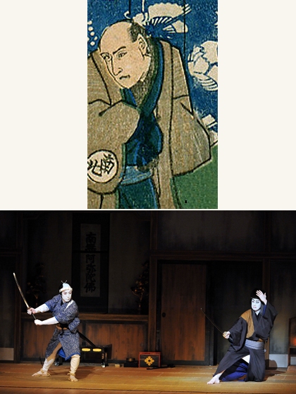 『東海道四谷怪談(とうかいどうよつやかいだん)』や『桜姫東文章(さくらひめあずまぶんしょう)』などで人気の高い狂言作者、四代目鶴屋南北は1755(宝暦5)年、江戸の中村座や市村座に近い乗物町の紺屋(染物屋)の型付職人の家に生れました。1776(安永5)年、初代桜田治助が立作者を勤めていた市村座で桜田兵蔵(さくらだひょうぞう)という名で見習い作者となり、その後沢兵蔵(さわひょうぞう)と名前を変え中村座や市村座に出勤した後、1782(天明2)年からは勝俵蔵(かつひょうぞう)を名乗り森田座に出勤します。長い間、狂言方(きょうげんかた。立作者の補助的立場にある二枚目、三枚目作者より下の雑務にあたる狂言作者)として貧乏生活を続けました。1803(享和3)年、50歳の時、河原崎座で上演された夏狂言の『天竺徳兵衛韓噺(てんじくとくべえいこくばなし)』が大評判となり、夏から晩秋に季節が移り寒さのため水中での立ち廻りができなくなるまでロングランとなります。南北はこのヒットによりようやく作者として認められるようになりました。南北という名前は、勝俵蔵が道化方の俳優三代目鶴屋南北の娘と結婚し婿に入っていたところから、義父の死後、四代目鶴屋南北と名乗ったことによります。これ以降、南北は俳優の名ではなく狂言作者の名となりました。長寿で最後まで現役を通し、1829(文政12)年11月、“一世一代”として『金幣猿島郡(きんのざいさるしまだいり)』を著し、その公演中の27日に75歳で亡くなりました。