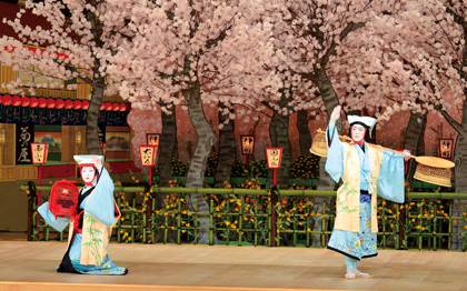 『吉原雀』[左から]鳥売りの女(中村七之助)、鳥売りの男(中村勘九郎) 平成25年9月歌舞伎座
