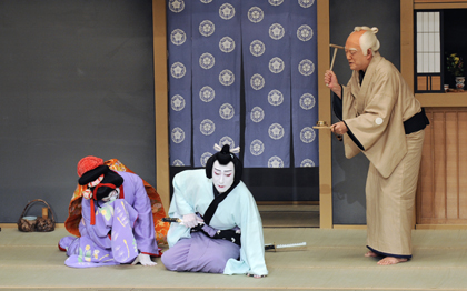 『菅原伝授手習鑑』賀の祝 [左から]桜丸女房八重(中村福助)、舎人桜丸(中村橋之助)、白太夫(市川左團次) 平成21年2月歌舞伎座
