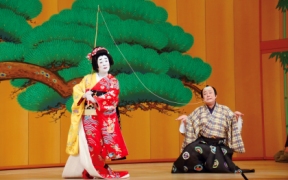 歌舞伎はそもそも出雲阿国(いずものおくに)の「かぶきおどり」から始まっていて、現在でも舞踊は歌舞伎の中で大きな部分を担っています。舞踊のことを歌舞伎では所作事(しょさごと)とも呼んでいます。所作事を演目として確立させた役者には初代瀬川菊之丞と初代中村富十郎が挙げられますが、特に富十郎は今日でも舞踊の大曲として人気を誇る『京鹿子娘道成寺』を初演して後世に伝えています。所作事は元々女方芸として位置付けられていましたが、それを立役として大成させたひとりに天明期の初代中村仲蔵がおり、さらに文化文政期には三代目坂東三津五郎、三代目中村歌右衛門などにより、いくつもの役柄を踊り分ける「変化舞踊(へんげぶよう)」が流行、今日でもおなじみの『浮かれ坊主』『越後獅子』などがここから生まれています。(金田栄一)