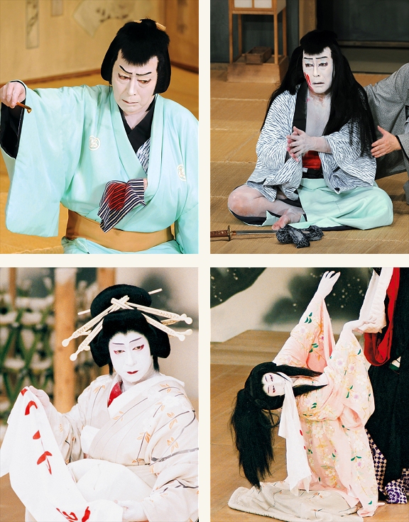 また『仮名手本忠臣蔵 六段目』の勘平は、舅殺しと責められて白刃を腹に突き立てますが、このときは段階的に美しく髪がさばけるように仕掛けがされています。まず髷の根元を崩し、髷をだらんとさせる「がったり」と呼ばれるしかけ。その後に、髷を束ねていた元結(もっとい)という紐を取り去り、ざんばら髪にします。このように髪がすべてほどけた状態にさせることを「総さばき」と言います。(立役の髪も、ほどけた髪を見るとかなりロングヘアです)。『東海道四谷怪談』のお岩の髪が抜け落ちる「髪すき」なども仕掛けによるもので、お芝居を不気味な雰囲気にいざないます。(田村民子)