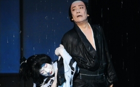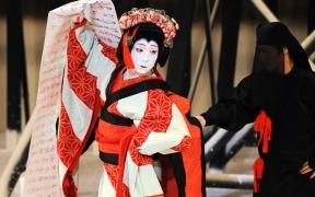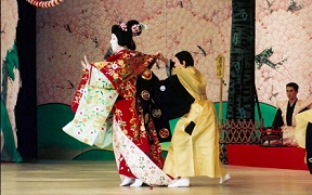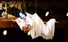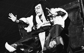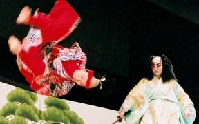 歌舞伎には、世阿弥が能を高尚な芸術として完成させるために捨てた軽業(かるわざ)や曲芸などが、受け継がれてきました。古代に大陸から入ってきた伎楽や散楽は、中国の辺境で行われていた軽業、曲芸、奇術、幻術、人形まわし(傀儡=くぐつ)などの芸で、社寺や民間の祭礼や放浪芸に伝えられてきました。『御湯殿の上の日記』の1588(天正16)年2月1日に「くもまい、ややこおどり参りて、御かかりにて舞い申す」という記録があり、初期の女かぶきと一緒に蜘蛛舞という曲芸が演じられたことがわかります。元禄年間(1688~1704)を代表する女方の名優・芳沢あやめと人気を競った水木辰之助は、恋の一念で猫に変身する所作事で絶賛され、江戸に下って市村座で猫の所作と槍踊りで人気になりました。当時の歌舞伎の女方の芸には、宙乗りや曲芸があったのです。現在でも、女方の踊りに「引抜き」「ぶっ返り」「海老反り」「人形振り」、傘や鞠、羯鼓などを使う芸があるのはその名残りです。明治以降の歌舞伎の近代化の過程で「ケレン」や「宙乗り」は排除されてきましたが、二代目市川猿翁によって復活され、今では歌舞伎の魅力の一つになっています。そのほか、トンボなどの「立廻り」や「だんまり」「本水」など、歌舞伎はもともと観客の度肝を抜く仕掛けや特殊な演出が得意なのです。(浅原恒男)