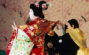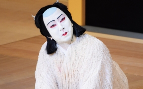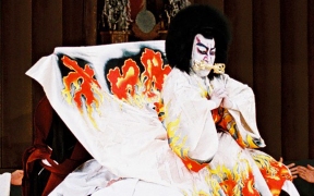 また『義経千本桜』「川連法眼館」では、狐が侍に化けた姿で登場するのですが、途中で狐の正体をあらわします。このとき、着物に袴をつけた姿から、一瞬で白いふさふさとした毛のついた狐を連想させる衣裳(「毛縫」)に変化します。(田村民子)
