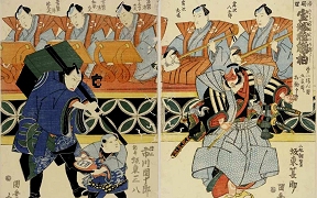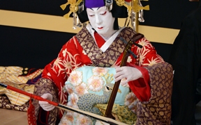 歌舞伎では、実に豊かでバリエーションに富んだ音楽が使われます。舞踊における長唄囃子連中の出囃子(でばやし)、床(ゆか)や山台で演奏される浄瑠璃(じょうるり)、そして劇中に黒御簾で演奏される多種多様な唄と三味線と鳴物の果たす役割も重要です。これらの音楽が俳優の演技と渾然一体となって、祝祭的な舞台芸術を現出するのです。歌舞伎は音楽面が非常に豊かな総合芸術なのです。(浅原恒男)
