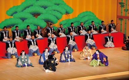 歌舞伎では、実に豊かでバリエーションに富んだ音楽が使われます。舞踊における長唄囃子連中の出囃子(でばやし)、床(ゆか)や山台で演奏される浄瑠璃(じょうるり)、そして劇中に黒御簾で演奏される多種多様な唄と三味線と鳴物の果たす役割も重要です。これらの音楽が俳優の演技と渾然一体となって、祝祭的な舞台芸術を現出するのです。歌舞伎は音楽面が非常に豊かな総合芸術なのです。(浅原恒男)