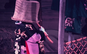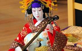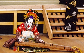 箏曲は武家や富裕な町人などのお屋敷内で愛玩されてきた音楽で、歌舞伎ではさほど出番は多くありませんでした。時代物の御殿や武家屋敷の幕開きに演奏される「琴唄」(「逢瀬うれしき添い寝の枕…」など)も、三味線で箏の音色と雰囲気をまねて演奏しています。しかし近代の歌舞伎の高尚化とともに、箏の専門家が演奏する機会も増えてきました。『助六由縁江戸桜(すけろくゆかりのえどざくら)』で助六が花道から登場する前に揚幕で演奏される尺八や、縁切り場に欠かせない胡弓なども、劇場付きの囃子方ではなく、それぞれの専門家が演奏します。(浅原恒男)