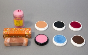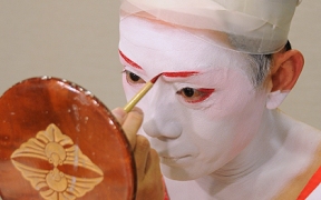 歌舞伎の化粧の方法は、まず顔全体を同じ地色で塗りつぶすのが基本である。色の濃淡で陰影を付けるなどはしないのは、浮世絵の美人画も同じである。その上から眉や目元の化粧、口紅、頬紅や髭などを描く。歌舞伎では、化粧することを「顔をする」といい、俳優が自身でやるので、メイクや顔師はいない。やり方や材料は俳優によってさまざまな工夫がなされていて、人によって違う点も多いので、ここではあくまで基本的な化粧の手順と使われる化粧品の一例を解説する。(阿部さとみ)