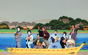 立作者の初代並木五瓶(左端)が、出演俳優一同に向けて自作を読んでいる。