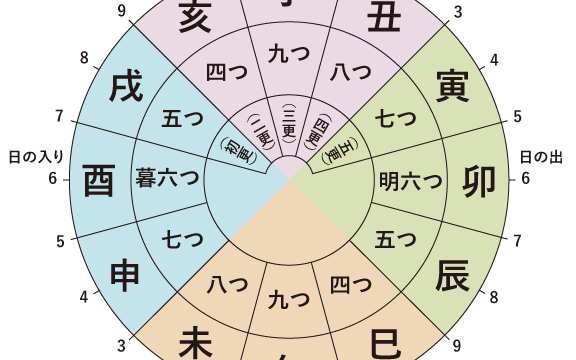 時刻を表わす単位には「四つ」「七つ」などの数字と「子」「丑」といった干支でおなじみの言葉が使われますが、夜明けの「明け六つ」と日暮れの「暮れ六つ」、そして午後零時にあたる「九つ(午)」を基本に覚えておくとよいでしょう。