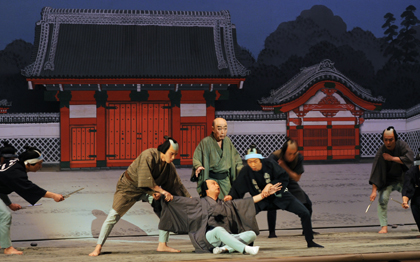 暗闇のなかに大勢の人物が登場する「だんまり」は、人々が手探りで大事な宝物を奪い合い、その過程で人物の関係が浮かび上がってくる。「だんまり」にはせりふがなく、争う人から人の手へお宝が渡る動きがみどころ。まさに宝物が必須アイテムになっている。大時代な扮装の人物が争う「時代だんまり」と、日常の扮装の人物が争う「世話だんまり」がある。(前川文子) 【写真】 『音羽嶽だんまり』[左から]七綾姫(中村梅枝)、鬼童丸(尾上右近)、将軍太郎良門(河原崎権十郎) 平成27年10月歌舞伎座