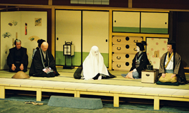 [左から]下男杢助(片岡亀蔵)、佐五兵衛後に道心者西心(坂東彌十郎)、妾おさよ(坂東玉三郎)、女房お藤(片岡秀太郎)、白蓮(市川左團次) 平成14年3月歌舞伎座