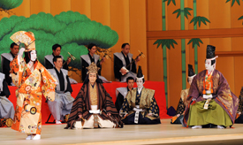 松羽目物の檜舞台に長唄囃子連中が居並んでいます。