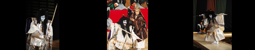 長刀を小脇に抱えて髪を振り乱し、凄まじい形相。荒れ狂う海の中から浮かび出て、平家を亡ぼした義経に襲い掛かる場面です。名乗りの後は義経に近付き、おそろしい怨霊の動きになります。しかし義経は少しも騒がず刀を手に渡り合い、弁慶は数珠を激しく揉んで必死に祈ります。やがて知盛の霊は花道へ押し戻され、幕外の引っ込みになり、次第に遠く去っていく幕切れとなります。その時、長刀を水車のように回して揚幕に入る場面。最後のクライマックスとなるのです。