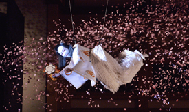 主馬小金吾武里(しゅめのこきんごたけさと)は『平家物語』にモデルとなる人物がおり、能『維盛』にも登場する。本作での見せ場は美しくはかなげな若武者と大勢の捕手たちとの藪の中のダイナミックな大立廻りだ。なかでも捕り縄を使った様式的なタテの美しさは、阪東妻三郎主演の剣戟で知られた映画『雄呂血(おろち)』(1925)から、立師(たてし)の名人坂東八重之助が創案したもの。前髪姿の小金吾に向かい大勢の捕り手が矢車のように放射状に縄を掛けてゆく動きは、俳優が息を合わせてはじめて成立するダイナミックな見どころである。三階席から見るのもお薦めだ。