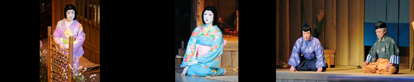 【右】[左から]夜叉王妹娘楓(市川春猿)、夜叉王姉娘桂(市川笑三郎)、楓婿春彦(市川猿弥)、面作師夜叉王(中村歌六) 平成16年7月歌舞伎座