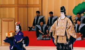能舞台を模した松羽目という背景。翁と千歳が厳かに登場。翁は位の高い神、千歳は若さを象徴する役。舞台中央にて深々と頭を下げ、人間が神に扮することへの畏敬の念を示す。千歳の若々しく颯爽とした舞に続き、翁が格調高く舞う。翁の定型、「袖を頭上にかざす型」や「両手を左右に大きく開く型」などが盛り込まれ、歌詞は能の「翁」の詞章をベースに、初春のめでたさや末永い繁栄を祝う歌詞で展開する。舞い終わった二人は再び礼をし、去って行く。